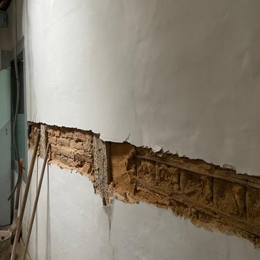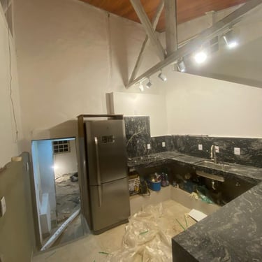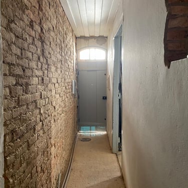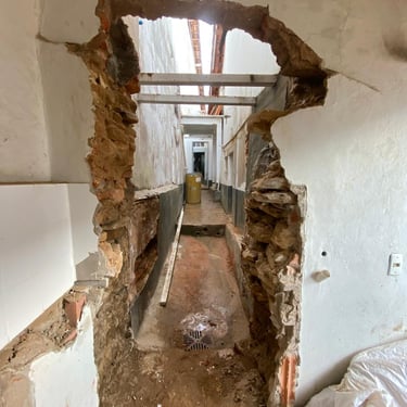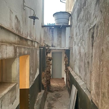 E não parou por aí. O embasamento das paredes, que à primeira vista parecia sólido, escondia um desgaste profundo causado por umidade ascendente. A parte inferior apresentava reboco estufado, manchas de mofo e infiltrações — sinais de que a impermeabilização nunca havia sido feita corretamente. Percebi que aquela reforma exigiria muito mais do que eu imaginava: seriam necessárias intervenções profundas para garantir a segurança e devolver a integridade do imóvel.