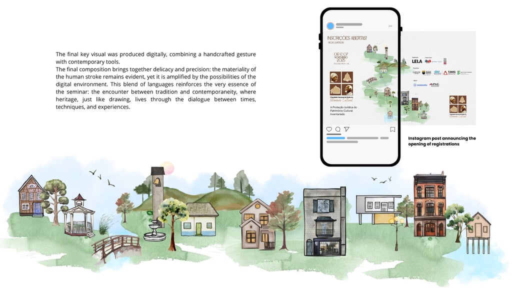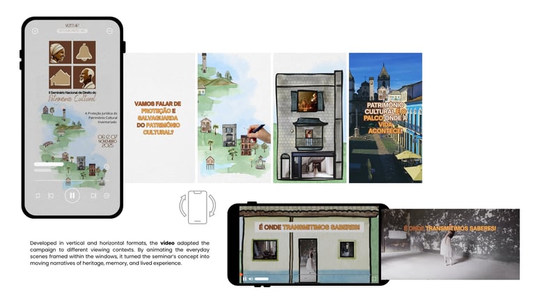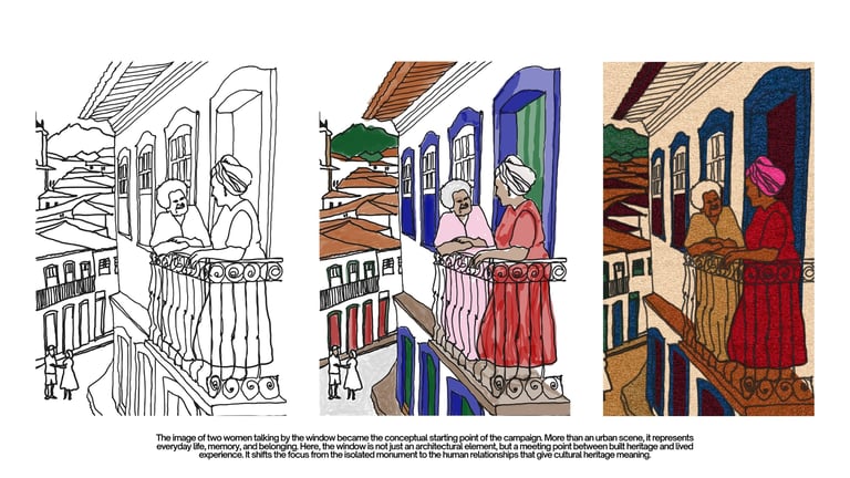 A divisão em quatro partes iguais cria um campo visual democrático, em que nenhum elemento se sobrepõe ao outro, assim como entendo que deve ser a relação entre patrimônio material e imaterial. Ao transformar o ato de olhar pela janela em conceito, o projeto procurou afirmar o patrimônio como experiência compartilhada, na qual símbolo e vida são inseparáveis. O logotipo recebeu licença para marcar fortemente Ouro Preto, por ser a cidade-sede do evento, mas a campanha foi desdobrada para outras expressões arquitetônicas encontradas no Brasil, das palafitas ao modernismo. Esse movimento ampliou a proposta para além de uma identidade local, convertendo-a em uma reflexão mais abrangente sobre patrimônio cultural, diversidade formal, modos de habitar e reconhecimento.