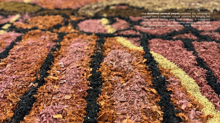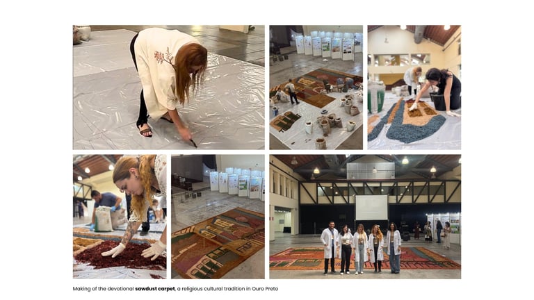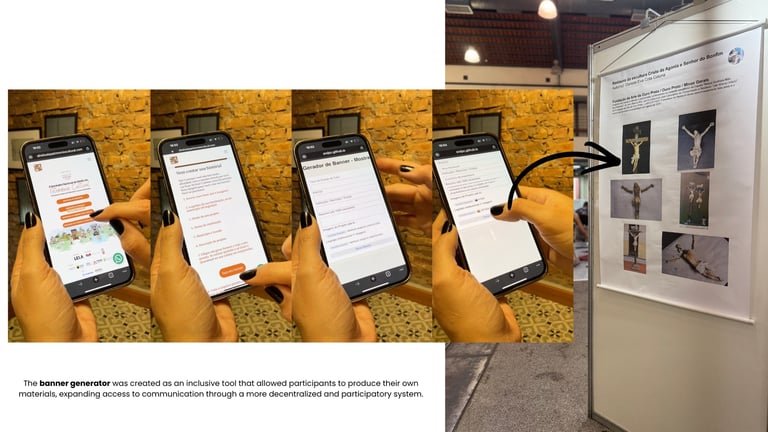 A campanha pode ser entendida como uma operação simultaneamente comunicativa, semiótica e política. Comunicativa, porque organizou um sistema claro de circulação visual para um evento nacional. Semiótica, porque estruturou um código coerente, em que ícones, índices e símbolos operam conjuntamente para produzir significação. Política, porque propôs outra forma de imaginar o patrimônio cultural: menos hierárquica, menos monumentalizante, mais democrática e mais próxima da vida. Seu objetivo não foi apenas dar forma a uma identidade visual, mas criar um campo de leitura e de participação no qual o patrimônio aparecesse como experiência compartilhada, construída por diferentes sujeitos, em diferentes tempos e materialidades. Essa ambição também se concretizou no gerador de banners online, gratuito e acessível, concebido para ampliar o acesso à produção visual e permitir que participantes elaborassem autonomamente seus próprios materiais, reduzindo barreiras técnicas e descentralizando a comunicação. A partir da mesma lógica, surgiu também a proposta de incorporar ao evento uma dimensão performativa e popular por meio da execução de um tapete devocional em serragem, com participação da FAOP. Ao trazer para o seminário uma prática profundamente enraizada na cultura local e em tantas outras cidades brasileiras, o projeto ampliou sua operação simbólica para além do campo gráfico, articulando visualidade, rito, matéria, trabalho manual e participação coletiva. Com isso, a campanha deixou de apenas representar o patrimônio para também colocá-lo em ato.