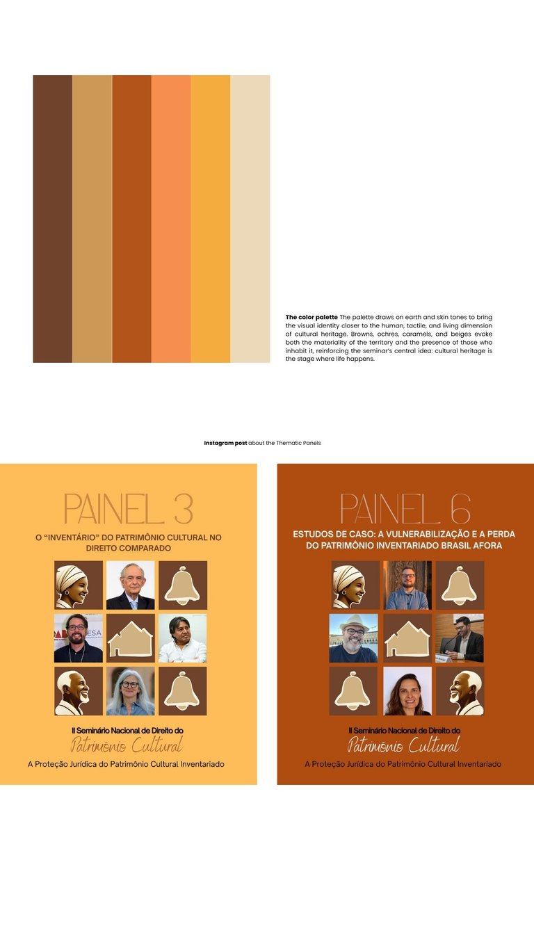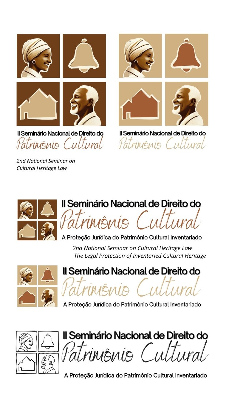 Este projeto foi concebido como um sistema visual democrático para o patrimônio cultural, estruturado a partir de uma imagem profundamente cotidiana em Ouro Preto: aquilo que se vê através das janelas quadriculadas das casas coloniais. Ao olhar por essas janelas, não se enxerga apenas arquitetura, mas a convivência entre patrimônio e gente, símbolo e vida, materialidade e experiência. Foi dessa síntese que surgiu o logotipo do II Seminário Nacional de Direito do Patrimônio Cultural, organizado em quatro quadrados que articulam, de forma equilibrada, diferentes dimensões do patrimônio. A janela, a casa e o sino remetem ao patrimônio material, à paisagem construída, aos marcos sonoros e ao conjunto arquitetônico que molda a identidade da cidade; a presença humana introduz o patrimônio imaterial, a vida social e a experiência partilhada; a diversidade de gêneros e idades afirma que o patrimônio só faz sentido quando reconhece aqueles que o vivem.